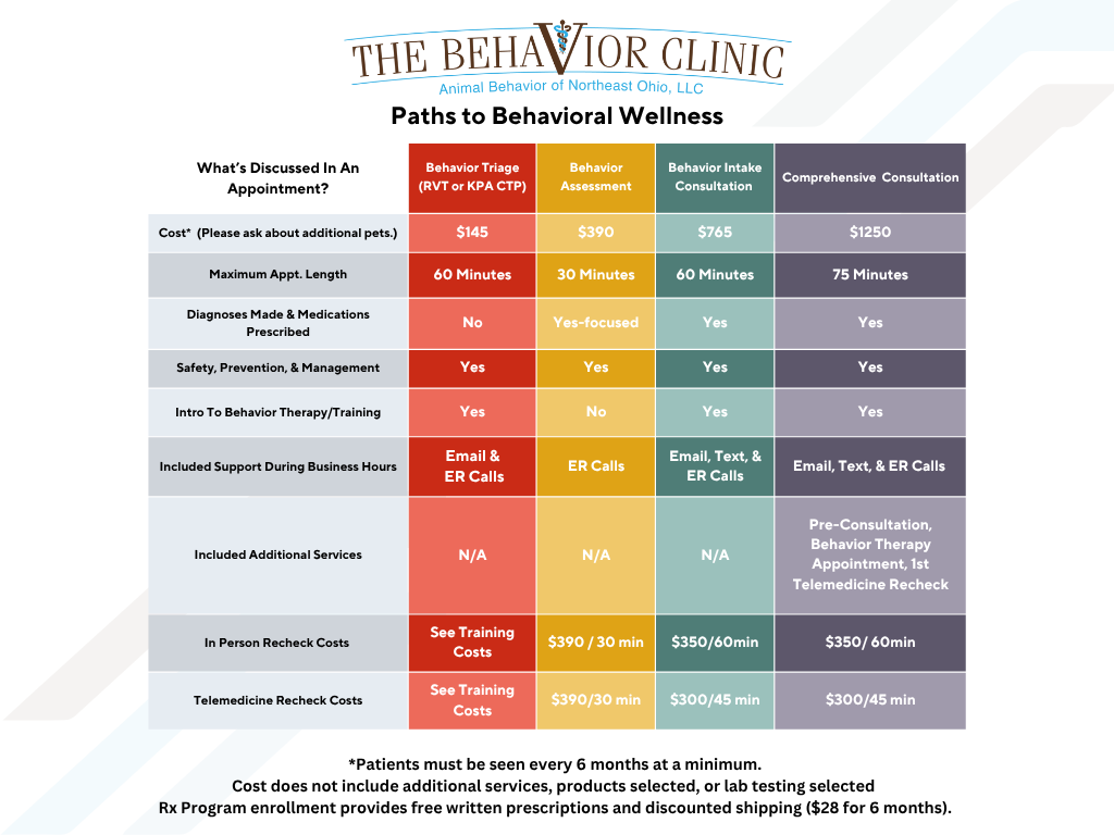 Your pet's treatment plan may include supplements, prescription medication, follow up appointments, lab testing, and behavioral therapy sessions. These items are an additional cost unless specified in your selected plan. Successful outcomes require ongoing monitoring and adjustments to the treatment plan which are accomplished through follow up appointments. We do not prescribe punishment (i.e., shock collars, prong collars, correction based training) to modify behavior.